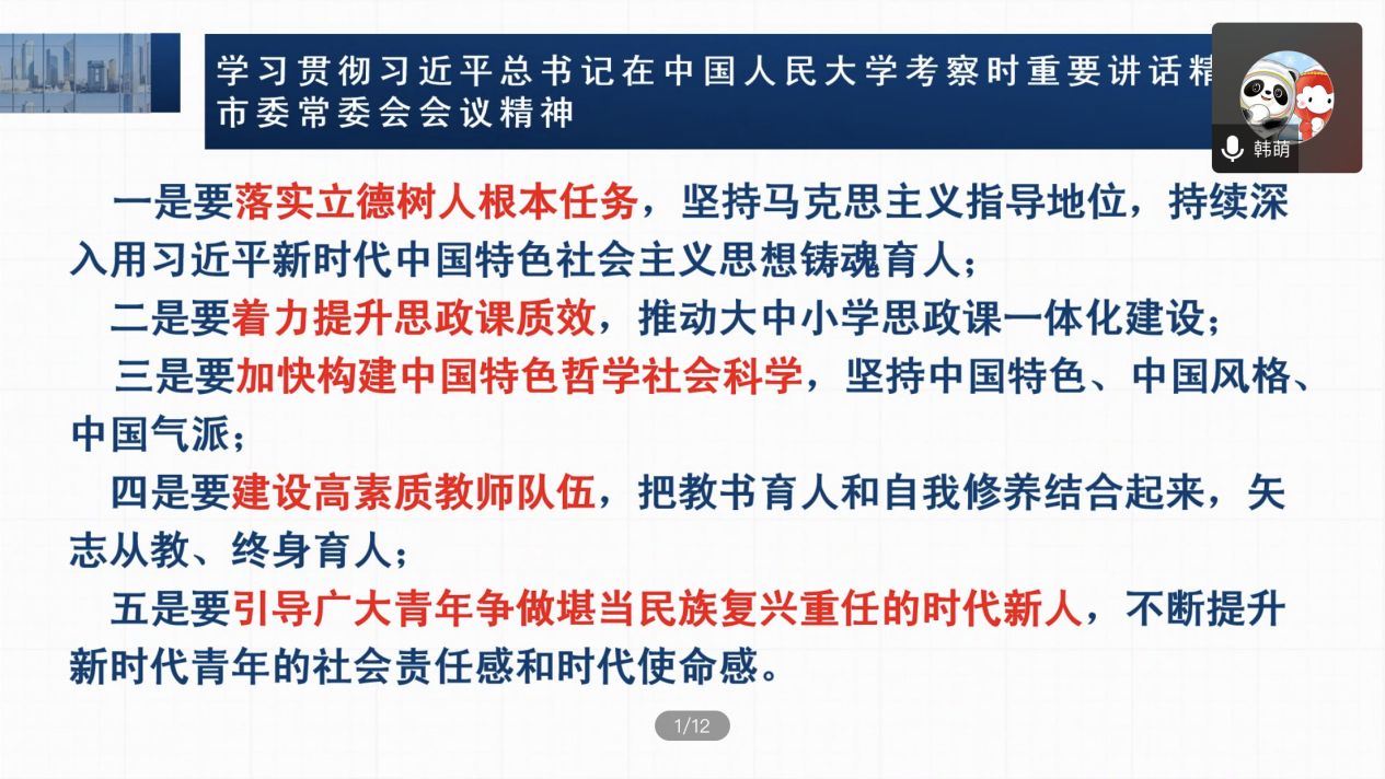 5月7日,学院通过线上会议召开全体会传达学习贯彻习近平总书记在中国人民大学考察时的重要讲话精神,学院党委书记韩萌指出习近平总书记来到中国人民大学考察,深情寄语广大青年,习近平总书记的重要讲话饱含着党对青年工作的深切关怀和对高等教育的殷切希望。要提高政治站位,增强政治自觉,把学习宣传贯彻贺信精神作为当前和今后一个时期的重大政治任务,切实加强组织领导,周密部署安排,主要负责同志要亲自抓,研究制定具体措施,不断把学习宣传贯彻引向深入,坚定捍卫“两个确立”,坚决做到 “两个维护”,坚定不移听党话、矢志不渝跟党走,培养堪当民族复兴和强国建设重任的青年栋梁。
