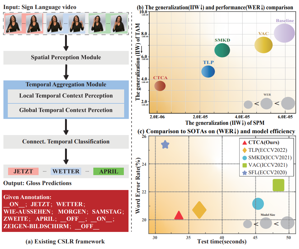 近日,由我院计算机视觉研究所陈胜勇教授、薛万利副教授共同指导的博士研究生郭乐铭撰写的论文“Distilling Cross-Temporal Contexts forContinuous Sign Language Recognition”被计算机视觉和人工智能领域国际公认的顶级会议IEEE/CVF Conference on Computer Vision and Pattern Recognition(CVPR 2023)录用。该论文针对续手语识别框架中空间感知模型难以得到充分训练的问题开展研究,提出跨时序上下文聚合模型框架。该框架首次实现了期望的时序聚合模型在同时具备较短的链式深度以及较强的局部-全局时序感知能力两方面的平衡,在测试性能得分、模型参数规模、平均测试时间、模型泛化性等多项指标上均达到领先水平。