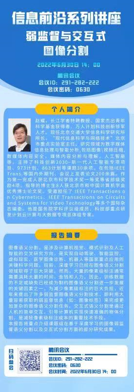 个人简介:赵耀,长江学者特聘教授、国家杰出青年科学基金获得者、万人计划科技创新领军人才。现任北京交通大学信息科学研究所所长,“现代信息科学与网络技术”北京市重点实验室主任。研究领域为数字媒体信息处理与智能分析,包括图像\视频压缩,数媒体内容安全,媒体内容分析与理解,人工智能等。主持了科技创新2030–新一代人工智能专项项目、973计划、863计划等课题30余项。在包括IEEE Trans.等国内外期刊、会议上发表论文200余篇。作为第一完成人获北京市科学技术奖一等奖等省部级奖励4项。指导的博士生8人获北京市和中国计算机学会优秀博士论文奖。受邀担任了 IEEE Transactions on Cybernetics、IEEE Transactions on Circuits and Systems for Video Technology等多个国际杂志编委。他是国务院学科评议组成员,科技部重点研发计划云计算与大数据专项总体组专家。