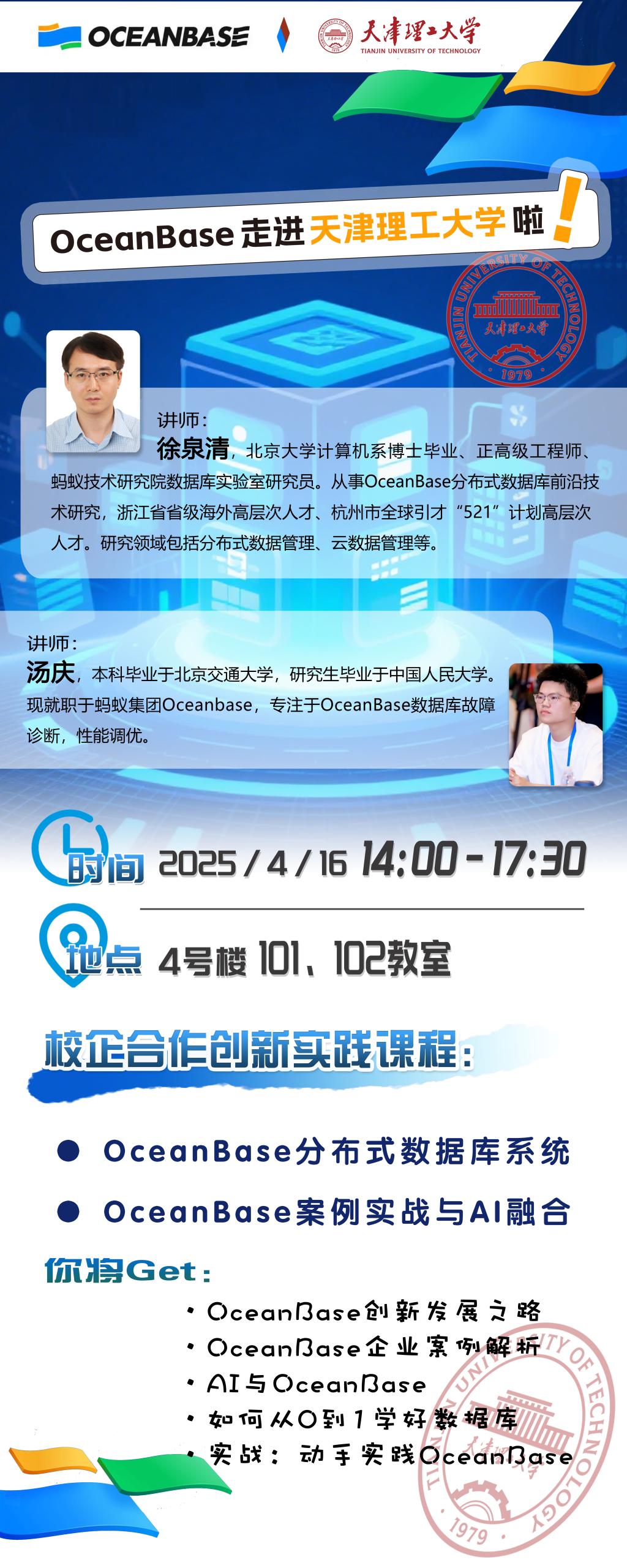 OceanBase高级工程师汤庆为学生们带来了一场理论与实践深度融合的《OceanBase入门与进阶》专题课程。课程以"案例解析+AI融合"为主线展开,通过支付宝交易系统、双11秒杀场景、快手短视频平台、海底捞餐饮系统及网商银行等真实案例,深入讲解OceanBase分布式数据库的架构设计与技术实现,重点解析了OceanBase如何应对企业级应用中的海量数据存储、高并发访问等核心挑战,融入了数据库前沿技术,包括向量数据库技术、AI与数据库融合等创新应用场景。汤老师还特别分享了OceanBase创始人阳振坤博士"九年磨一剑"的创业历程,以"从0到1"的研发故事,激励学生们夯实数据库理论基础,培养工程实践能力。最后,通过一个实战任务-动手实践OceanBase,让学生们动手搭建OceanBase数据库集群环境,完成数据库操作。学生们对项目实践表现出了极大的热情,现场互动氛围浓厚,反响热烈。